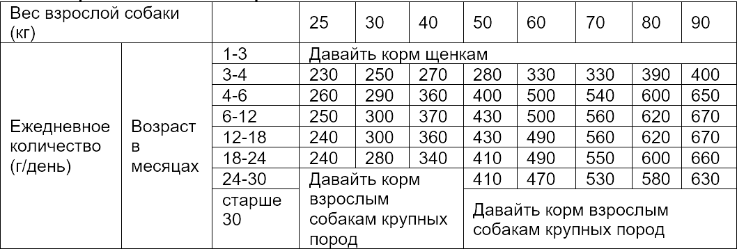 Корм можно давать сухим или слегка увлажненным. Ежедневно потребляемое количество корма зависит от возраста, размера, уровня активности животного, а также от условий окружающей среды. Всегда следите за тем, чтобы у Вашего питомца было достаточно свежей питьевой воды. Рекомендуемое ежедневное количество корма представлено в таблице рекомендаций по кормлению.